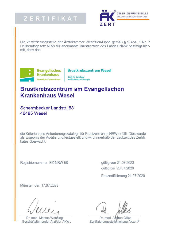 Die fachlichen Anforderungen und definierten Qualitätskriterien erfüllt das durch die Zertifizierungsgesellschaft der Ärztekammer Westfalen-Lippe, ÄKZert zertifizierte Brustkrebszentrum am Evangelischen Krankenhaus Wesel voll und ganz. Zudem hat es die Auszeichnung Brustkrebszentrum mit Empfehlung der Deutschen Krebsgesellschaft e.V. (DKG) und der Deutschen Gesellschaft für Senologiee.V.