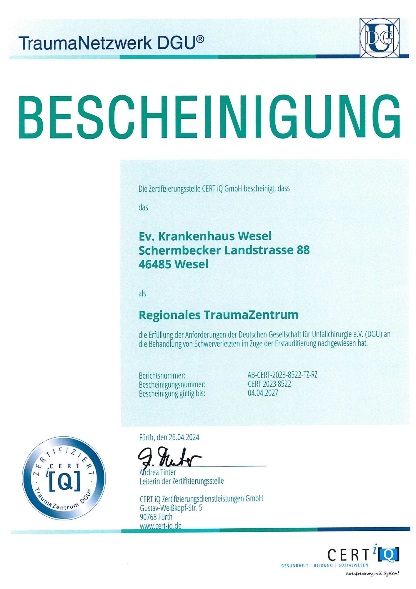 Wir sind als Regionales Traumazentrum von der Deutsche Gesellschaft für Unfallchirurgie (DGU) zertifiziert. Damit halten wir ein umfassendes Versorgungskonzept und medizinische Expertise vor, um sogenannten „polytraumatisierten“ Patient:innen – also Patient:innen mit mehreren gleichzeitigen schweren Verletzungen – schnellst- und bestmöglich behandeln zu können. Dazu gehören Verkehrsunfallopfer, aber auch beispielsweise Opfer von Stürzen oder bei Verbrennungen. Dafür stehen bei uns rund um die Uhr Mitarbeiter:innen aus den verschiedenen Fachabteilungen bereit, welches bei der Ankunft einer solchen schwerverletzten Patient:in im Schockraum bereits vollständig anwesend ist.