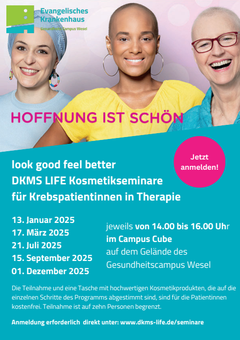 Gerade bei einer Krebserkrankung sind die Folgen der Chemo- oder Strahlentherapie oft deutlich erkennbar. Häufig leiden die Patientinnen unter Haar- und Wimpernverlust oder auch Hautirritationen. Eine speziell geschulte Kosmetikexpertin gibt den Teilnehmerinnen Tipps und praktische Anleitungen, wie Frau sich mit professioneller Gesichtspflege und perfektem Make-up behelfen kann. In entspannter Atmosphäre können alle Kosmetikartikel ausprobiert werden. Denn schön sein tut gut, steigert das Selbstwertgefühl, schenkt neue Lebensfreude und hilft so die Lebensqualität zu verbessern.