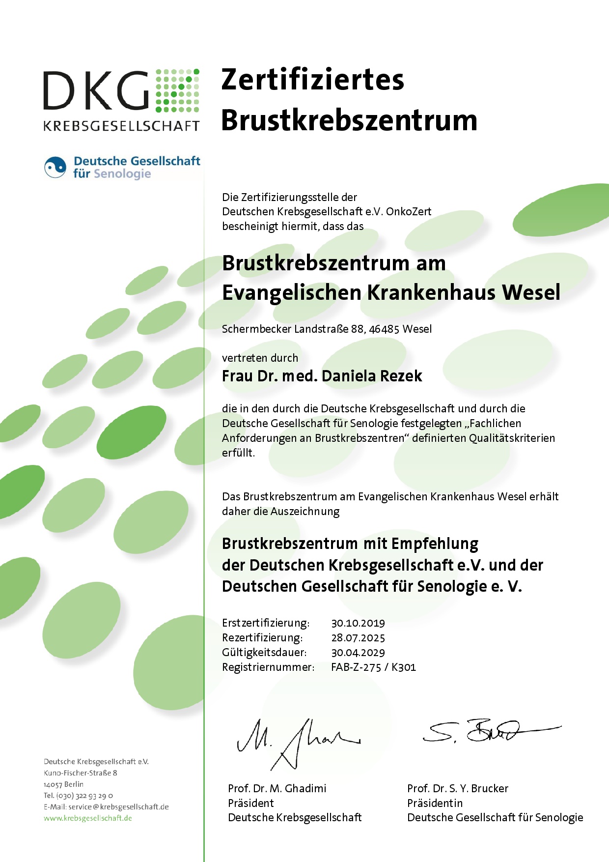 Die fachlichen Anforderungen und definierten Qualitätskriterien erfüllt das durch die Zertifizierungsgesellschaft der Ärztekammer Westfalen-Lippe, ÄKZert zertifizierte Brustkrebszentrum am Evangelischen Krankenhaus Wesel voll und ganz. Zudem hat es die Auszeichnung Brustkrebszentrum mit Empfehlung der Deutschen Krebsgesellschaft e.V. (DKG) und der Deutschen Gesellschaft für Senologiee.V.